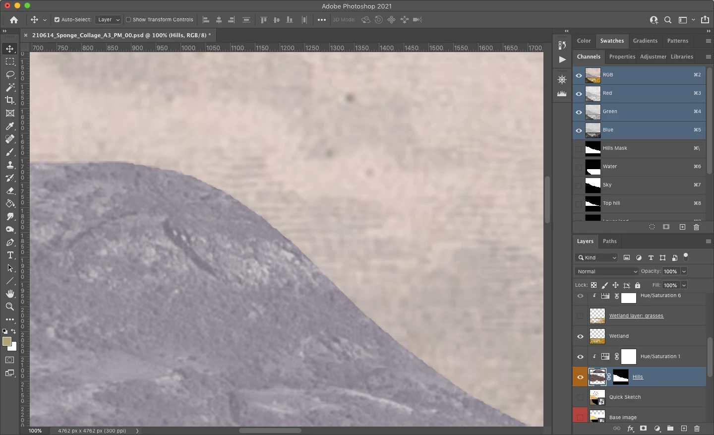 ^ this is the work as it appears in the workspace. The layer in question is the hills in the background of the image: in the workspace they are a purple mauve colour. However, when I export, the hills layer changes colour to a blue colour: