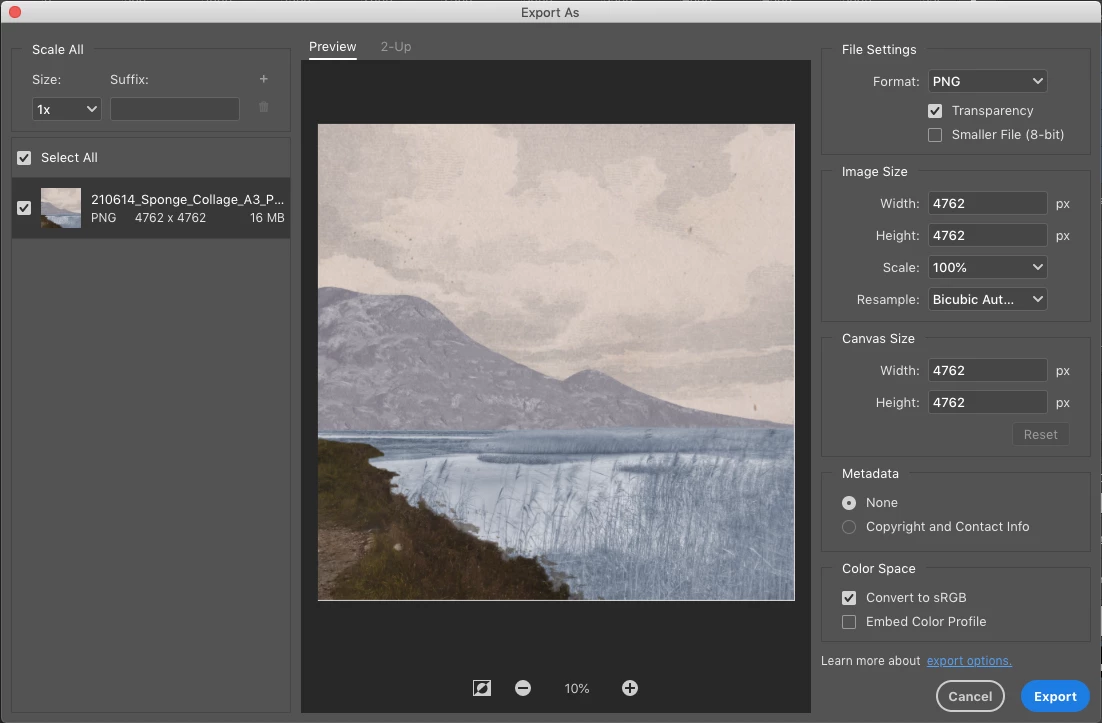 For reference, here are screenshots of my exporting options (notice how in the 'Export As' dialogue box the hills are the wrong colour) -