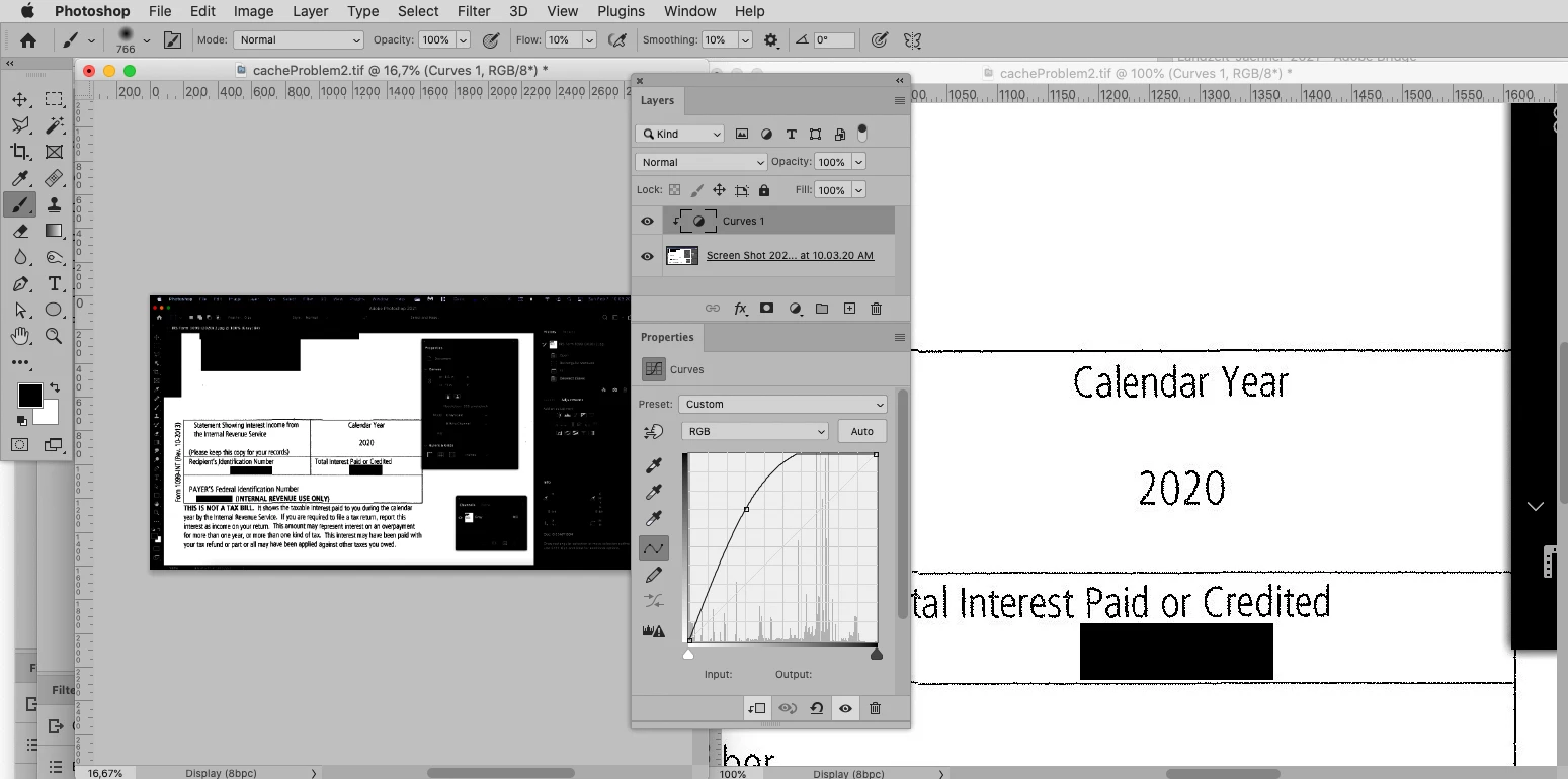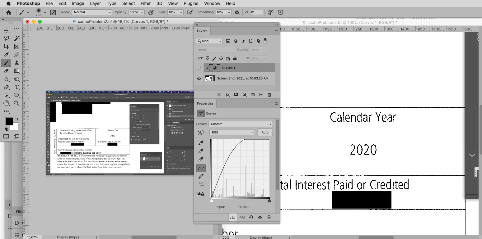 I scanned a few documents and am using Photoshop to pretty them up. While Photoshop will accept my image and canvas size adjustments, it won't take any adjustments to Brightness, Contrast, Curves, etc. I can preview them as I make the adjustments, but when I click on "OK," they revert back to the original.