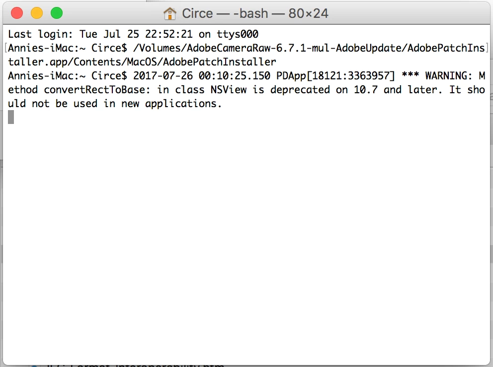 I tried downloading the Camera Raw 6.7.1 again and installing with the instructions on that page, but it did not work. This was what came up on the Terminal.