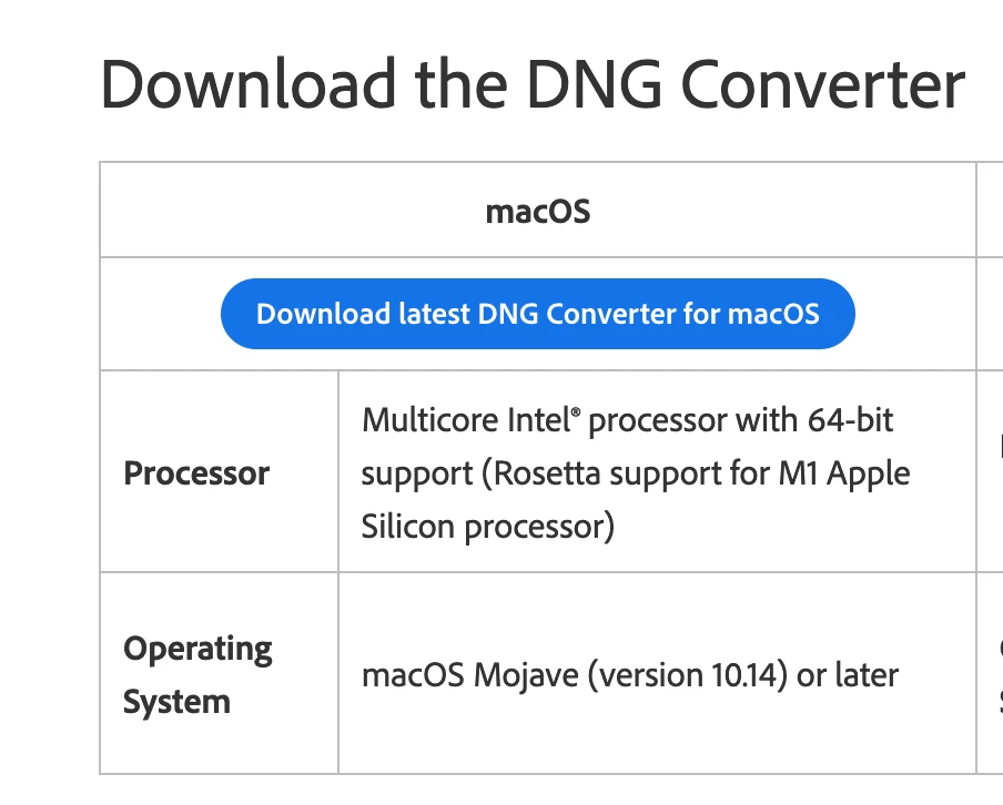 I have just downloaded the latest version of Adobe DNG converter. When I tried to install it, it said I needed macOS 10.15 or later while stating on the website download page it's compatible with Mojave (version 10.14) or later.