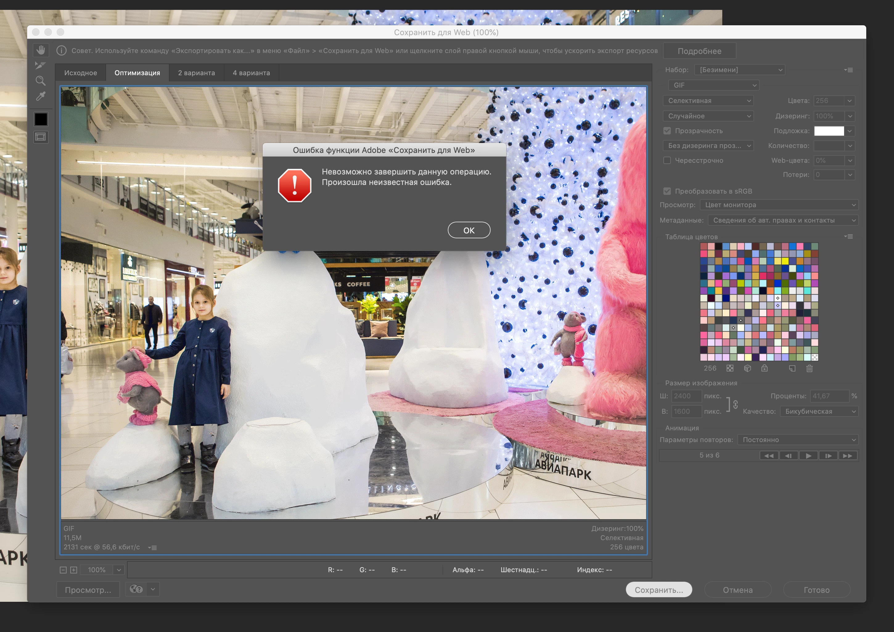 При сохранении файла анимации для web в формате gif выскакивает вот такая ошибка