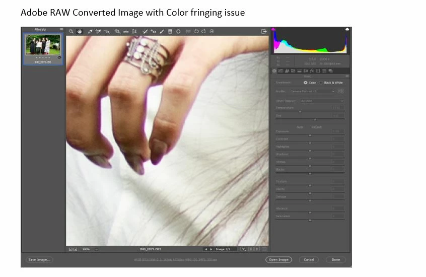2. Same file opened in Adobe raw version released with 2020 ACR12 latest version I am getting image slightly washedout and purple and green fringes which happens similar to chromatic aberration.