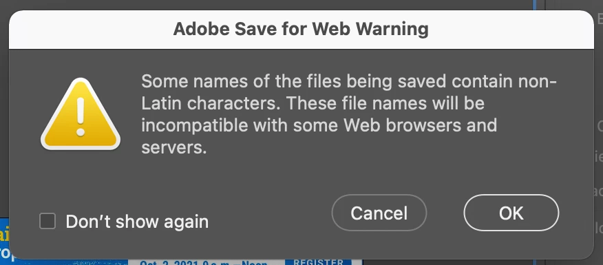 I'm getting this message "Adobe Save for Web Warning" when saving image as jpg. Rest of messages reads: "Some names of the files being saved contain non-Latin characters. These names will be incompatible with some web browsers and servers."