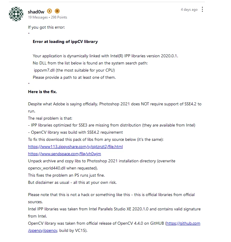 When I click 'open' i am notified of an "error at loading of ippCV library"