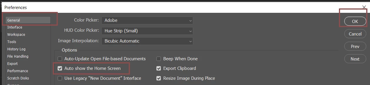 • Please restart Photoshop and press CTRL + K (Windows) or Command + K (Mac) to open General Preferences of Photoshop.