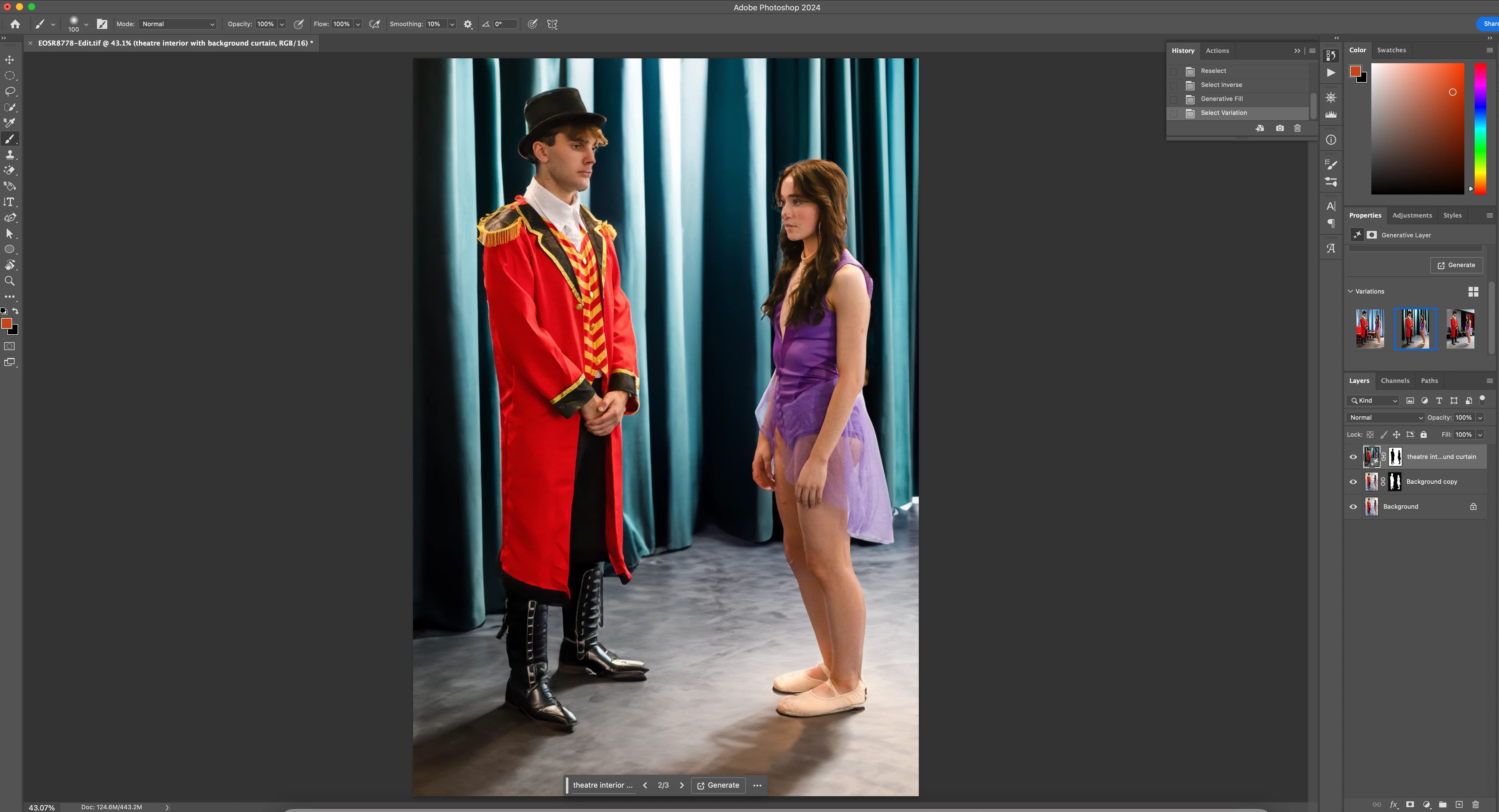 When I refined my selection in Select and Mask I get the mask for my subject I then inverted the selection and typed in "theatre interior with background curtain" in the Generate toolbar that gave me the background mask.