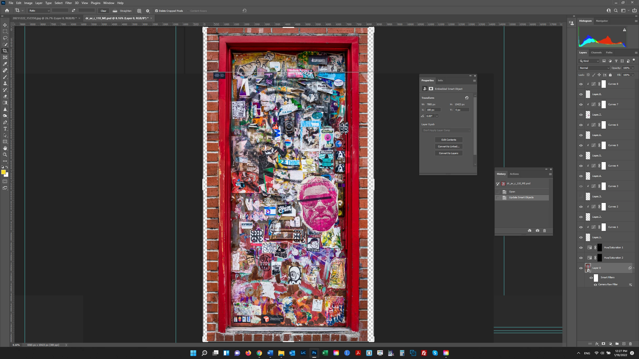 I have a document which was assembled from multiple RAW files, and subsequently discovered that I got the aspect ratio wrong - the door is wider than it should be. The main layer is a Smart Object, with separate Layers above it where adjustments needed to be made individually. I opened the SO and made the image 2" narrower, but the layers became unaligned with the main Layer. Do I need to flatten the document so that the individual Layers are made part of the Smart Object Layer? Ideally, it would be nice to retain the adjustments, both in the SO and in the individual layers. Also, when I opened the SO and made the image narrower, after closing the SO, the canvas kept its original size (see screenshot). Since there is no other Layer below the SO, where is the canvas and - independently of my other issues - would I need to access Canvas Size to conform the Canvas to the Image? Thanks.