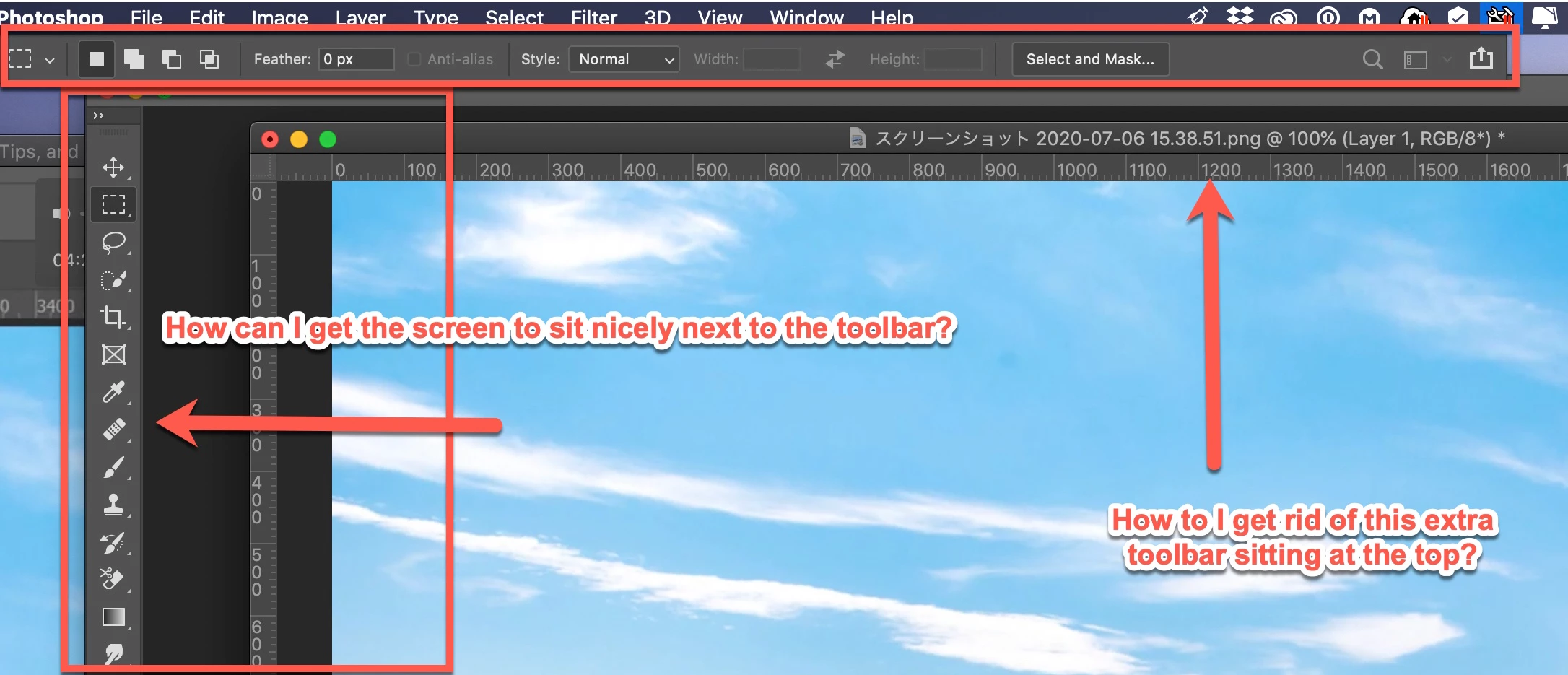 I'm not sure how to explain this. However, here goes. My photoshop workspace is acting isolated from the toolbar on the left for some reason. Also, there is a bar across the top which I would surely love to get rid of if possible. At times, photoshop displays on the left side of the mac and I have to physically move it back into the center.
