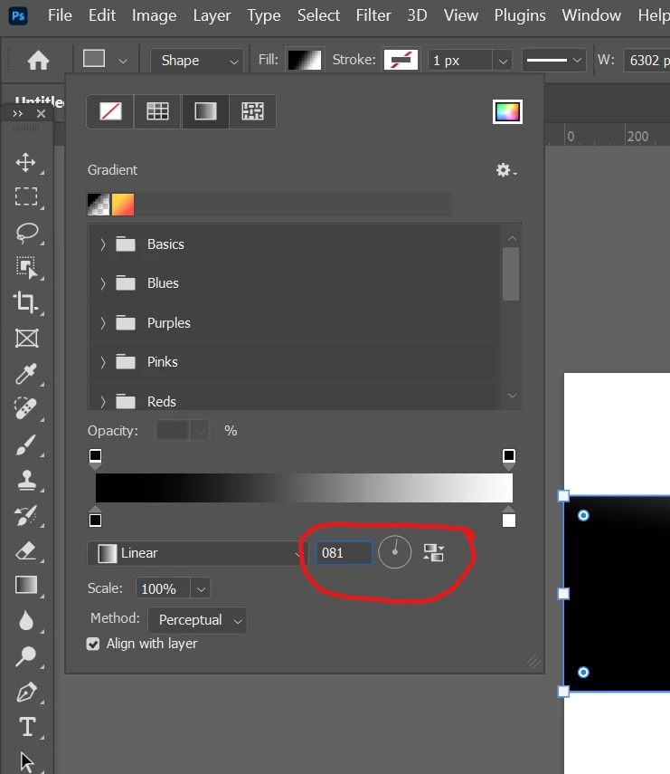 While creating a new shape with a gradient fill, I try to enter the number for the angle of the gradient that I want (e.g., 180°) the numbers type in backwards (e.g., 081°). I thought that maybe I'd inadvertently hit some code on my keyboard or changed a setting in the application that makes numerals type in backwards, but when I created a text box in the document and type in the same digits, they appeared correctly. When I typed in 081 I got the 180° angle that I wanted. I tried this both with the number keys above the letters on the main keyboard as well as the numbers on the numeral pad and got the same result. I installed the most recent update to Photoshop to see if that corrected the issue and it is still doing the same thing. I've been using Photoshop for 25 years and never encountered this before. Is it a bug or am I just overlooking something I'm doing wrong? I'm using Photoshop 2024 v. 25.1 on Windows 11.