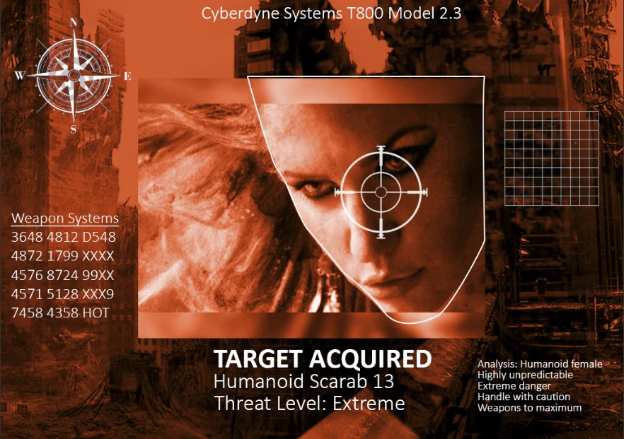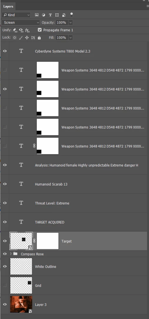 JJ, the head shot comes from the OP's forum profile page, so I assume it is a shot of her. There are several shots of the same person. It is on a separate layer to the decayed cityscape background, so a trivial matter to move and animate, but I went with the Terminator HUD rather than the extreme flicker in the OP's GIF. The same techniques apply though, and can be used to move things however you want.