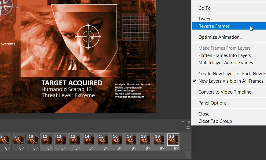 The new frames will remain selected so you can Reverse Frames from the pop up menu, and have a sort of reciprocation, backwards and forwards animation. I am sure it was obvious, but there is precious little information about frame animations, and it is largely a case of work it out for yourself.