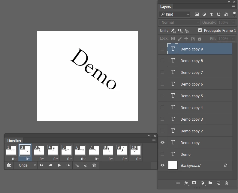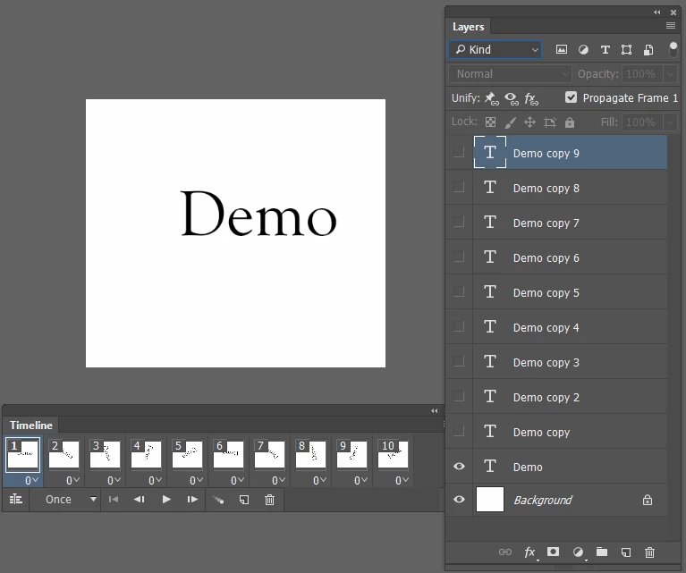 The .gif is 34 frames. It seems to be stuck of the first frame, as the frame count cycles, then plays five frames and jumps back to being frozen on the first frame. This is driving me nuts. I've tried everything I can think of, including starting from scratch by copy/paste each frame layer into a new file and following steps 1 - 8. When I do that the .gif won't play at all. The frame count cycles through all 34 frames, but the image is static. Anyone know what I'm doing wrong or how to fix this? Your feedback is greatly appreciated.