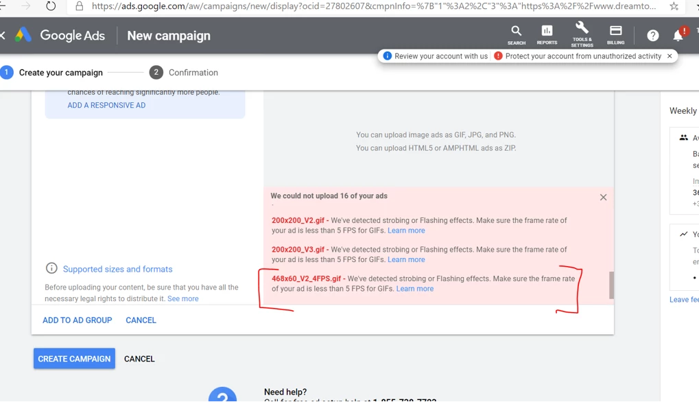 The graphics were originally created in After Effects and then saved out as an animated GIF (via plugin). I then open that GIF file in Photoshop to render a video and choose to save as 5 FPS as one of the options. I then optimize the file on an online website, which also saves at 5FPS. All these steps but I still get the error message. I'm at a loss.