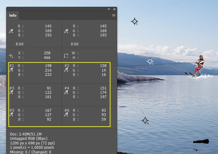 2. Selective adjustment: Bring the exposure of the bag up to where the red channel reads 205.