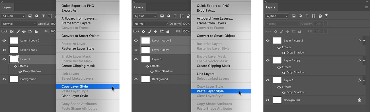 I have the following problem. I have several pictures, each one in a different layer and I want to apply the same effect to all pictures and then export each layer individually. The problem is that if I use an adjustment layer, the effect doesn't apply to the layers when I tell Photoshop to save each layer individually, and if I don't use an adjustment layer, then I have to manually apply the effect to each layer. Is there a way to copy an effect and paste it to every layer without resorting to adjustment layers? Or is there a way to keep the adjustment layer working when using layers to files?