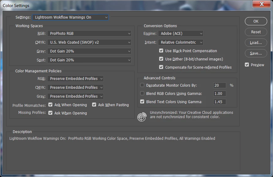 Here are my Color Settings. I've tried resetting PS Preferences and using the North America General Purpose setting to recreate the below saved settings. The issue remains the same.