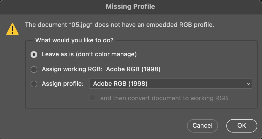 When opening files with missing color profile in photoshop, it gives you a panel with three choice: