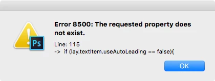 I have run into a bug. This is a script that I only run on text layers. The script will perform some tasks that some of it depends on whether or not Leading is set to (Auto) or a user defined setting. It worked great until this morning when I came across an instance where it told me that there was an error in the code (line marked in red) and that there was no such attribute to the layer. This particular text layer was set to Auto Leading. If I converted it to a specific leading and then back to Auto the script would work, but of course I don't want to do that every time I come across this.