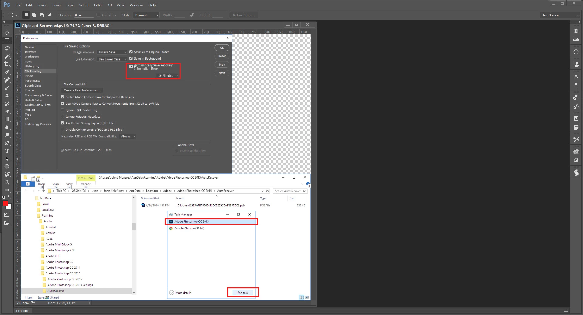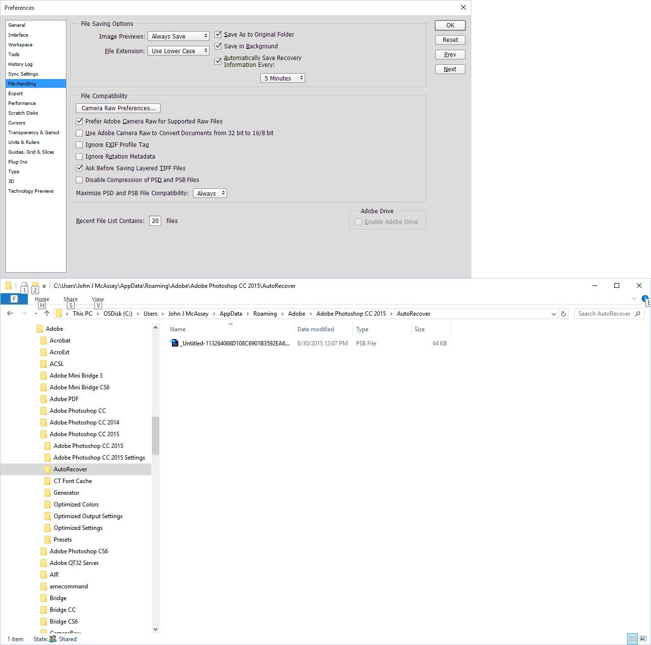 Auto-save and Auto-recovery in Photoshop CC 2015 - do not work