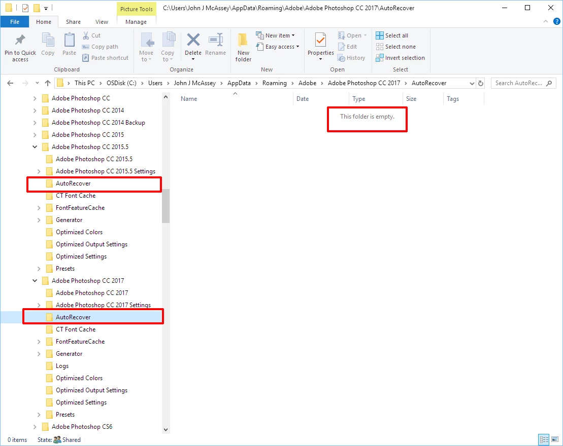 If auto recovery files exists when you start Photoshop.. Photoshop will open them as PSB documents so you can recover your work. Your user ID Photoshop versions Autorecover folders are normally empty. Only dirty files remain in there when Photoshop or your system crashes. Recovery files are deleted when you save or close out you documents in Photoshop.