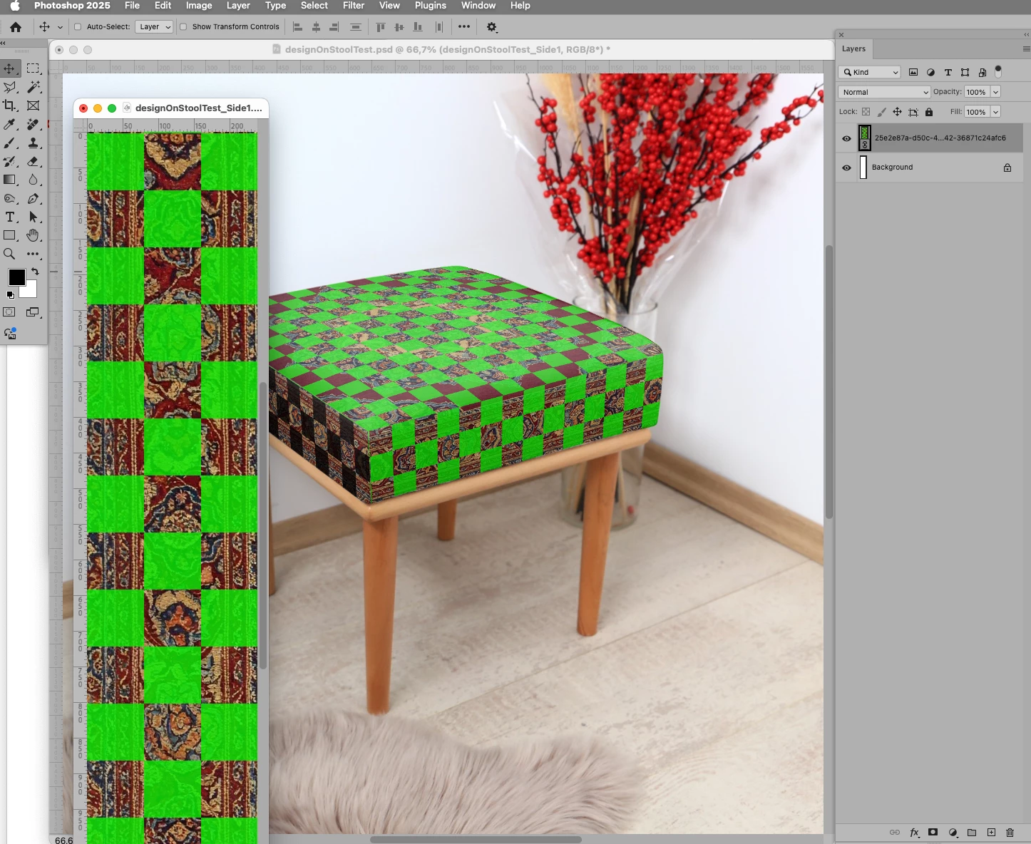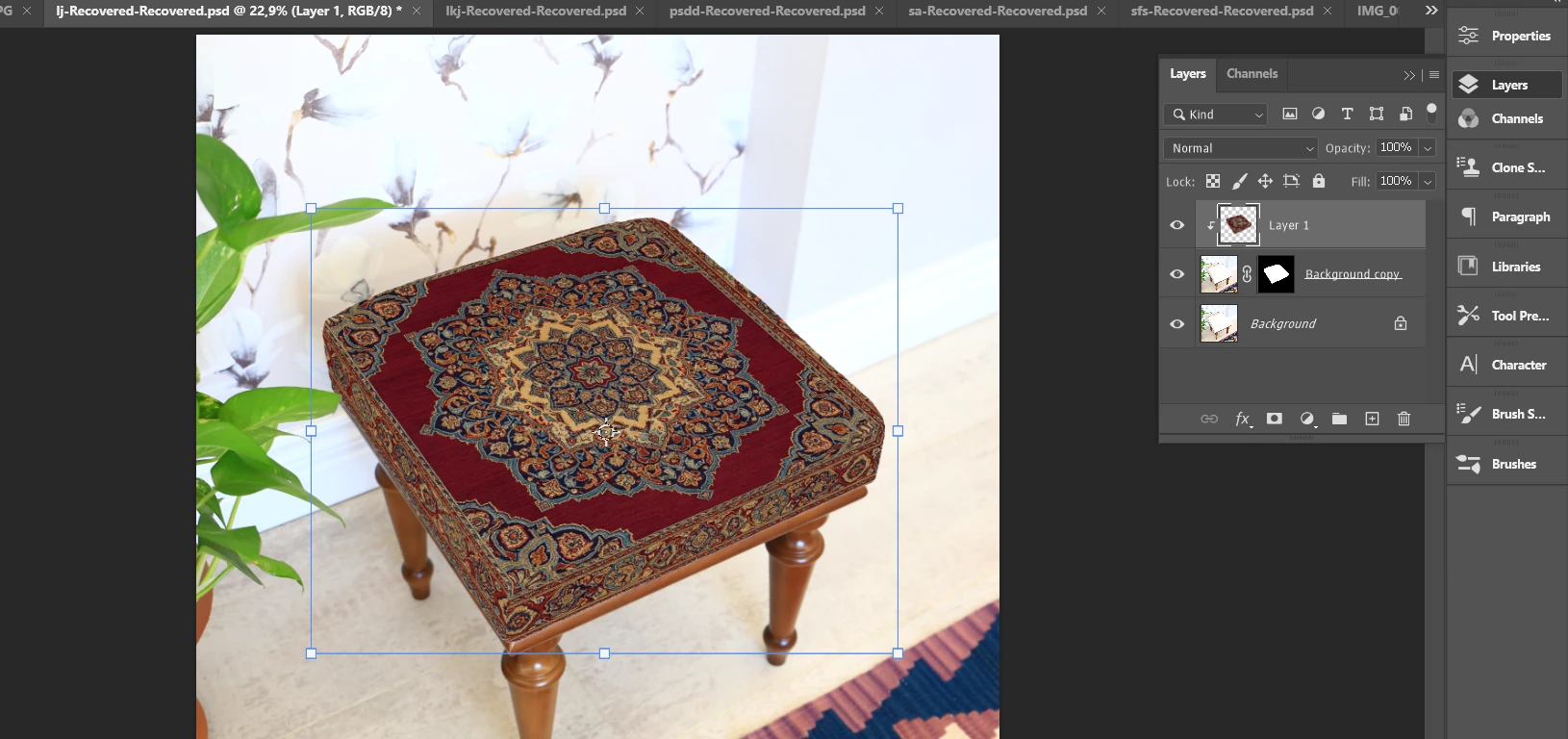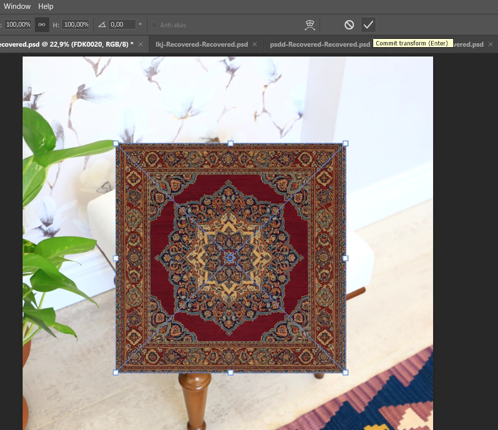 I'm trying to create a mockup in Photoshop where I apply a rug pattern onto a cushion. I have photos of the object (the cushion) from 7 different angles, and I want to automate the process using a script inside Photoshop. I can do this manually using the Vanishing Point tool, but it's very time-consuming. When I try to automate it with an action, it doesn't record the Vanishing Point steps. And when I try to use a script, it can't access the Vanishing Point tool either.