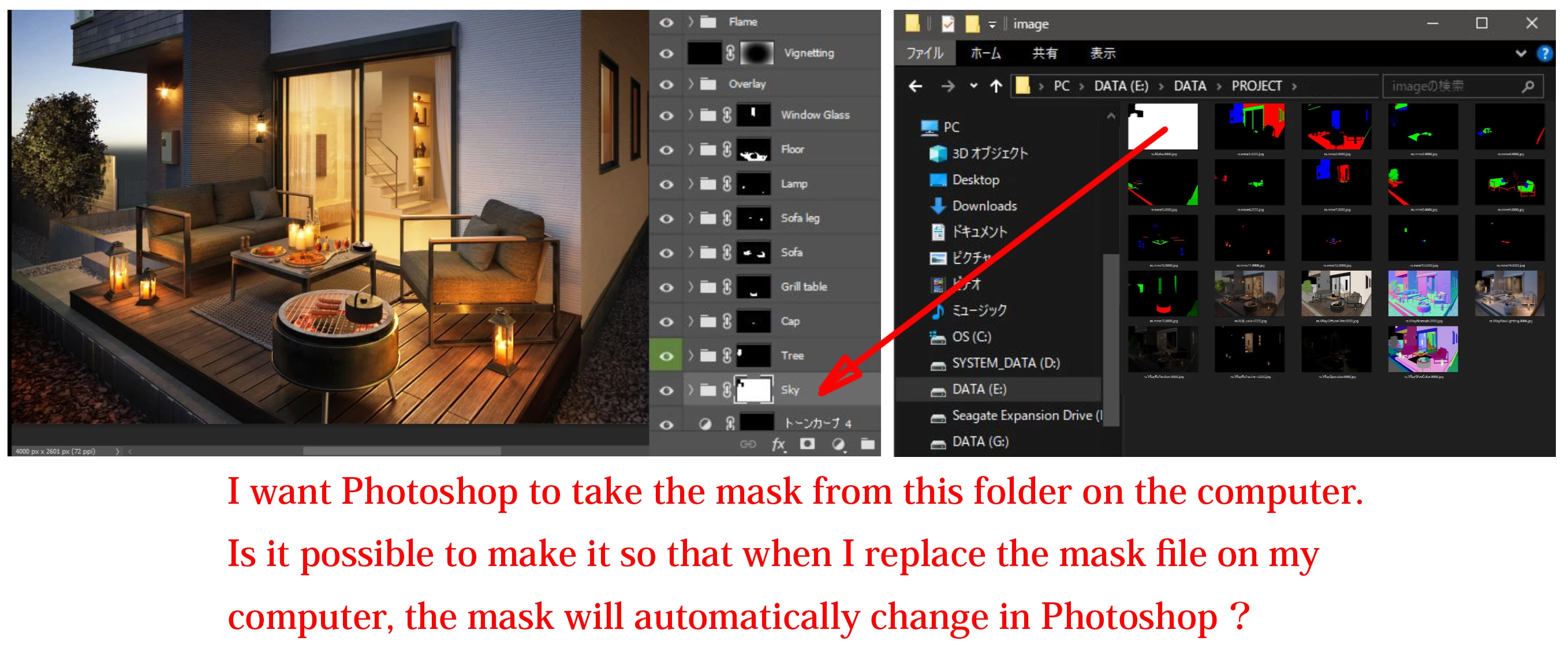Вопрос к знатокам. Я часто работаю с ретушью архитектурной визуализации. Обычно у меня все объекты в фотошопе разбросаны по папкам и на папку назначена маска. Например, папка стена кирпича и его маска, а здесь стена бетонная. Внутри папки просто корректируем цвет. Папки 10-20 на проект. Но после того, как ретушь закончена, клиент часто просит изменить геометрию объекта. Кирпичная стена увеличивается, бетонная стена уменьшается, все маски меняются после рендеринга. По сути, ретушь остается, но нужно поменять все маски. Вопрос, можно ли организовать это автоматически в фотошопе. Чтобы все маски вели в общее хранилище. Я просто заменяю все файлы в этом хранилище и все. Есть ли такая возможность в фотошопе?