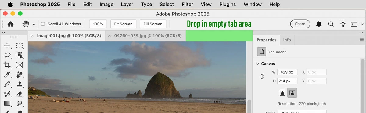 If you drop inside the Photoshop workspace, the file opens as a separate document tab if you drop it into the empty part of the tab strip highlighted in the picture below. If you drop a file inside the window of an open document, Photoshop assumes you want to add it to that document. So you can control how the new file comes in by choosing where you drop it: