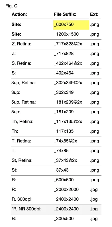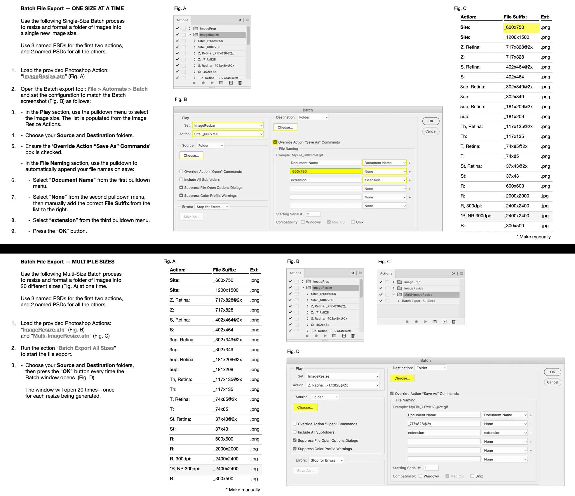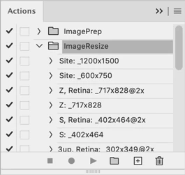 - The first set has 21 actions — Each action resizes a folder of images into a particular image size and resolution, appends each file name with that size, and then saves each file as a PNG.