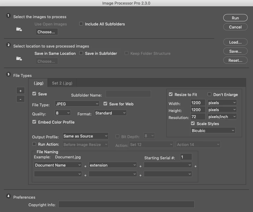 - The second set runs through each of the first set's actions, one after the other so you can batch resize a folder of images into multiple image sizes and resolutions, append all the file names, and save them all as PNGs...