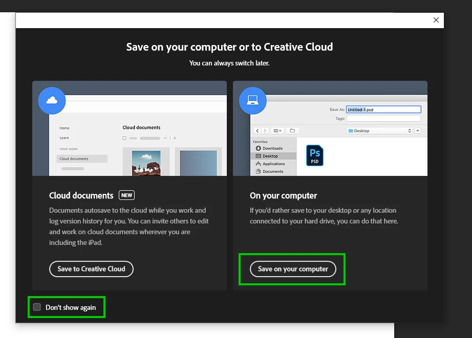 Put a check mark in"Don't show this again" and select "Save on your computer"