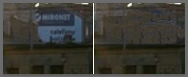 1) White advertisement on building: even after clone-stamping it, the colour white is far too loud to not draw attention. How can I tackle this?2) When clone stamping distant objects, the noise or texture in the original image does not copy, while gives a 'painted over' look. Can provide an example if unlcear, but how do I avoid this?