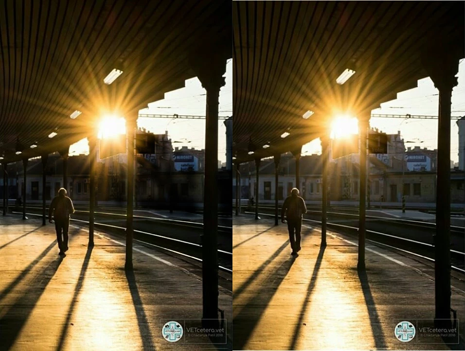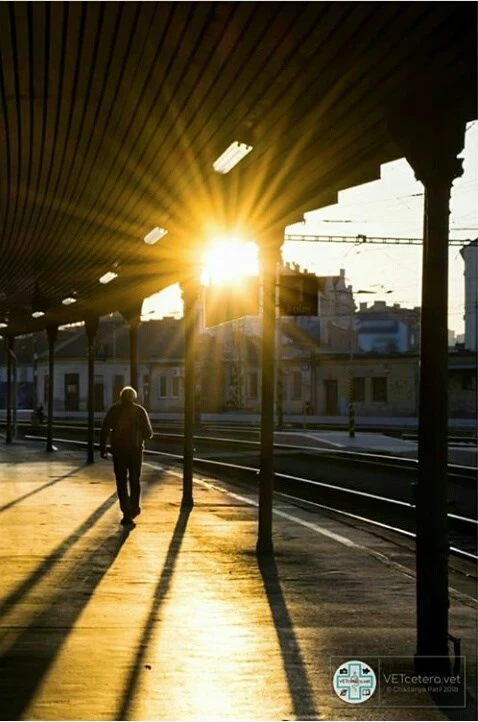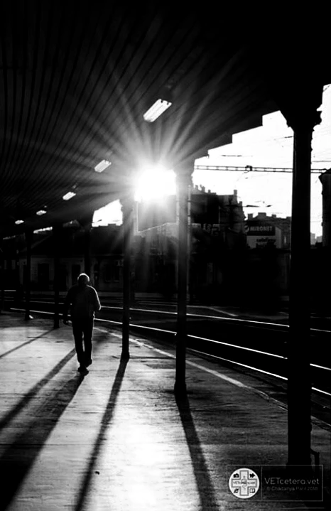 I'm not a big fan of B&W, but this might be an occasion when it works.  It has those leading lines into the bright flare of the sun, and your  eye then goes back to the bright highlights on the man on the platform.  The rails also lead the eye to the figure on the platform.  It's a decent image.