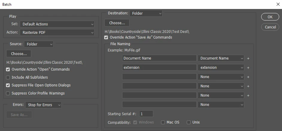 I figured I could save a lot of time if I created an action and then did a batch process on the whole folder. However, the problem I am running into is that when the batch process saves the file into the new folder, it saves each file over the top of the previous saved file with the same name. So my 194 files from the one folder becomes 1 file in the new folder, with the file name that was used when I set up the action. If I add a serial number or something to make the filenames in the new folder unique, I just get Foreword1.pdf, Foreword2.pdf, Foreword3.pdf instead of the original files' names. How can I have the batch process open the files from one folder, process the action, then save WITH THE SAME FILENAME to another folder? Seems like this should be really easy but I've been working on this for several hours and still can't get the desired result. It's really critical that the filenames of the processed files are exactly the same as the original files, so that I end up with two folders of files: Folder1 with the original files, Folder2 with the exact same files, the only difference being the files on Folder2 have all been rasterized.