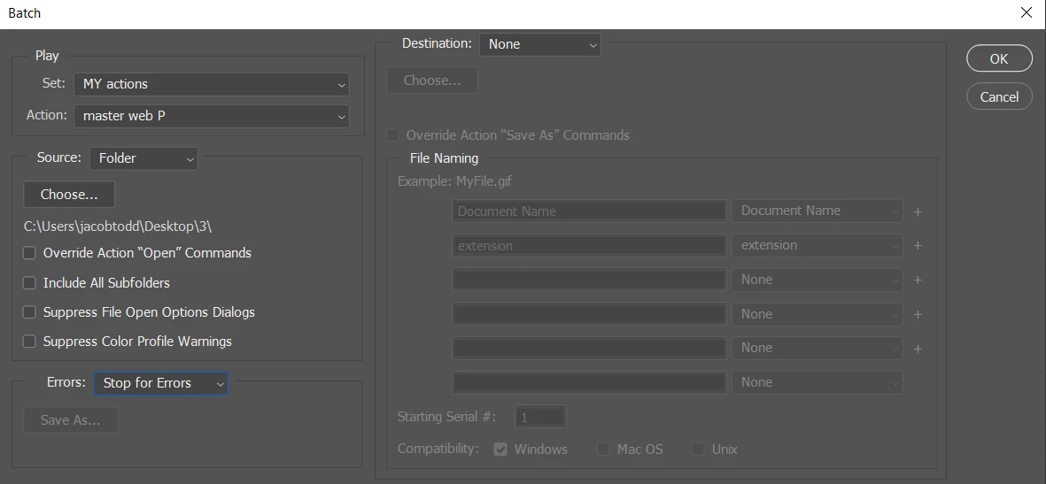 I have created an action i wish to use to batch process 100's of images in a folder and its subfolders.
