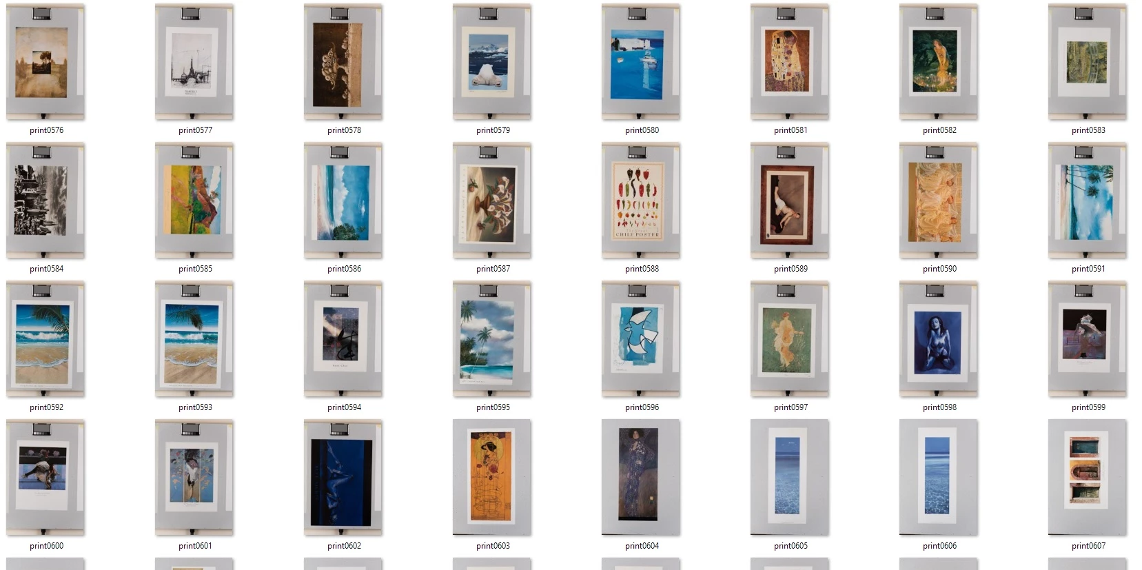 I sell fine art prints, and have created an inventory of photographs that I have taken of all the individual physical paper prints I have. I have many more to photograph, but at present, I have taken over 1200 photos. Each print is laid onto a custom-made vacuum table screwed to the wall, and then photographed with two flash soft boxes, with the camera tethered to Lightroom. I have prints that are 4" x 3", and some 5ft x 4ft.