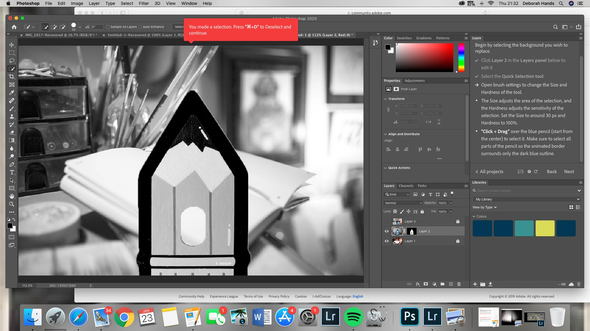 Doing the tutorial on how to import your own background image. Followed the step by step instruction and selected one from my desktop. The image appeared but all the tutorial background and blue pencil layers disappeared. I tried to go 'back' on the tutorial which it let me do and now I'm stuck on 2/5 page, the 'next' button is no longer illuminated and all it is showing me is a red info box telling me how to deselect something using a squiggle sign on the CMD key and D. ... I've now tried this and nothing is happening, it appears I'm stuck.