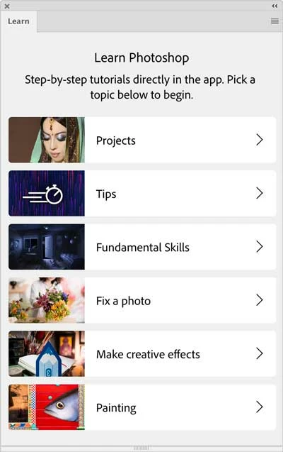 The Learn panel contains interactive projects. These are fully integrated with Photoshop, so they will download and open a sample Photoshop document for you to work on, and lead you through completing each step inside Photoshop itself.
