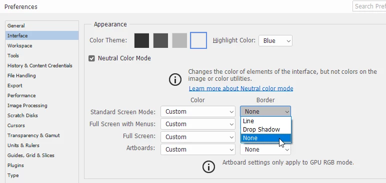 Go to Preferences > Interface > Standard screen mode > Border, and make sure that it's set to None.