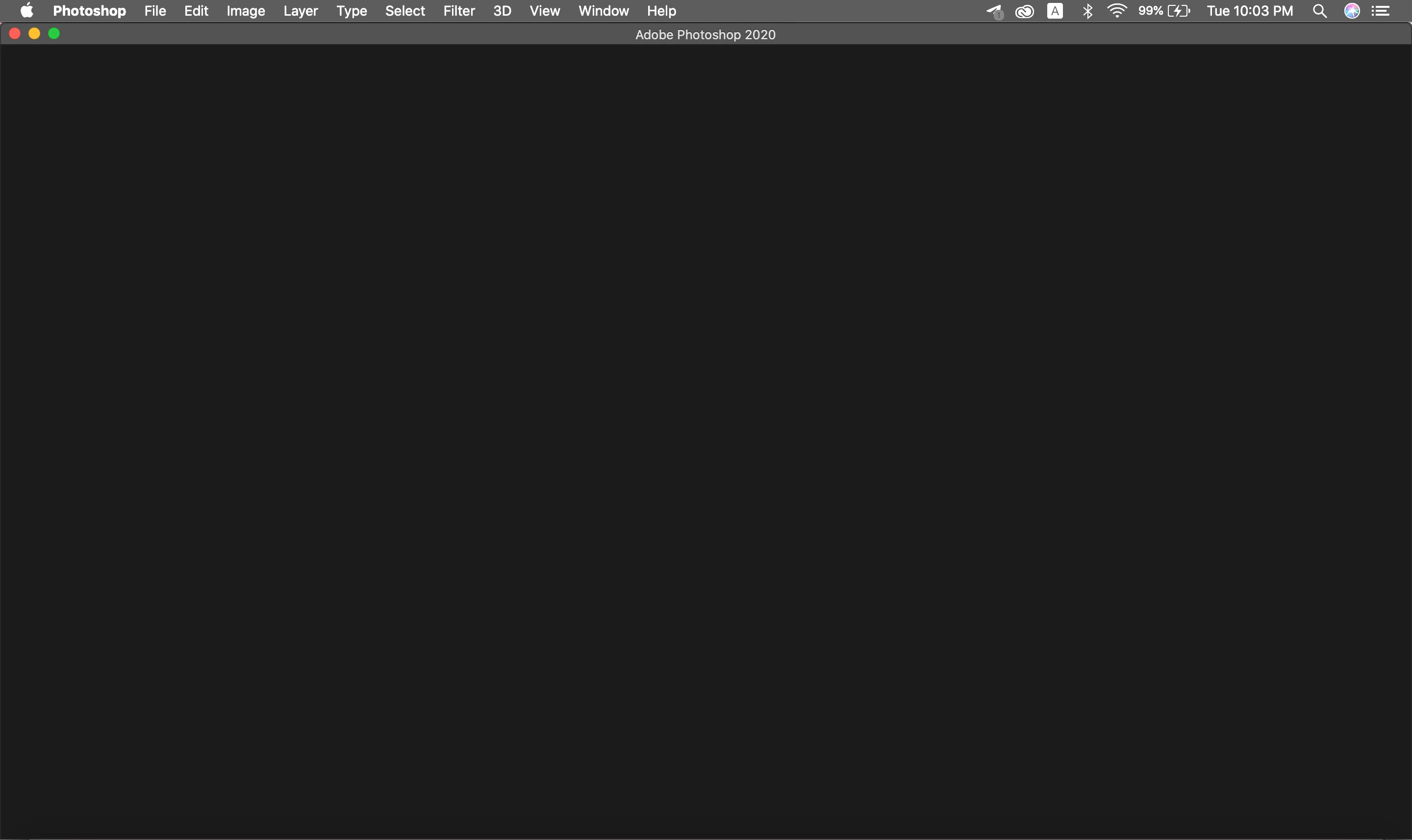 Recently, I have been unable to use Photoshop (and Illustrator). Opening the application results in this black screen. I am on the 21.1.3 version of the app, and I use a Macbook Pro, updated to the latest possible version. Attached is the screenshot from when I open Photoshop. I've attempted unchecking the graphics processor and reinstalling. Attempting to create a new file renders useless too. What should I do?