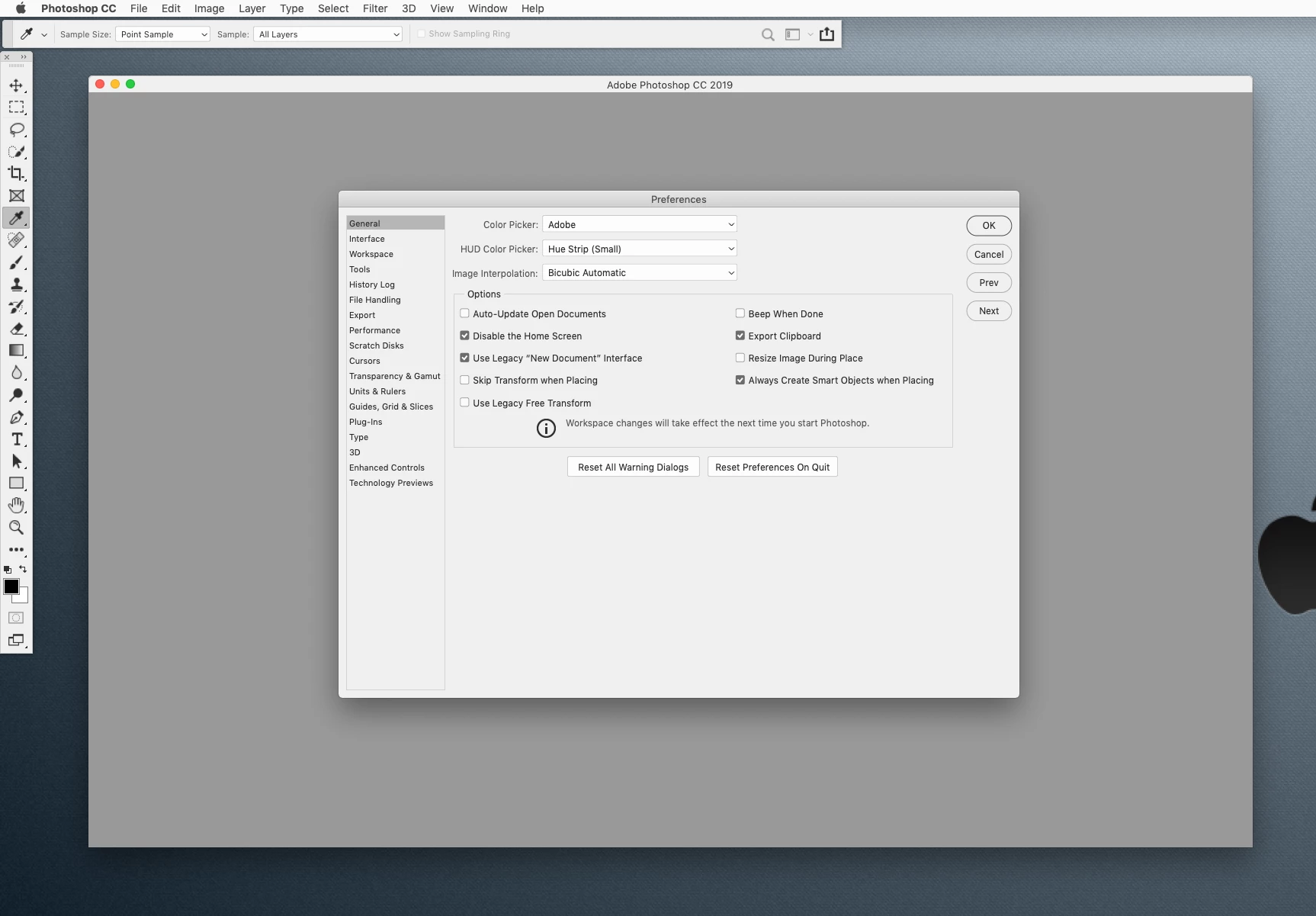Adobe Photoshop Version: 20.0.6 20190724.r.80 2019/07/24: 1207344 x64 Number of Launches: 6 Operating System: Mac OS 10.14.6 System architecture: Intel CPU Family:6, Model:14, Stepping:3 with MMX, SSE Integer, SSE FP, SSE2, SSE3, SSE4.1, SSE4.2, AVX, AVX2, HyperThreading Physical processor count: 4 Logical processor count: 8 Processor speed: 2600 MHz Built-in memory: 16384 MB Free memory: 8942 MB Memory available to Photoshop: 13249 MB Memory used by Photoshop: 70 % Alias Layers: Disabled. Modifier Palette: Disabled. Highbeam: Enabled. Touch Bar Property Feedback: Enabled. Image tile size: 1024K Image cache levels: 4 Font Preview: Medium TextComposer: Latin Display: 1 Main Display Display Bounds: top=0, left=0, bottom=1440, right=3440 Display: 2 High DPI Monitor Display Bounds: top=806, left=-1680, bottom=1856, right=0 Display: 3 Display Bounds: top=0, left=3440, bottom=1440, right=6880 OpenGL Drawing: Enabled. OpenGL Allow Old GPUs: Not Detected. OpenGL Drawing Mode: Advanced OpenGL Allow Normal Mode: True. OpenGL Allow Advanced Mode: True. AIFCoreInitialized=1