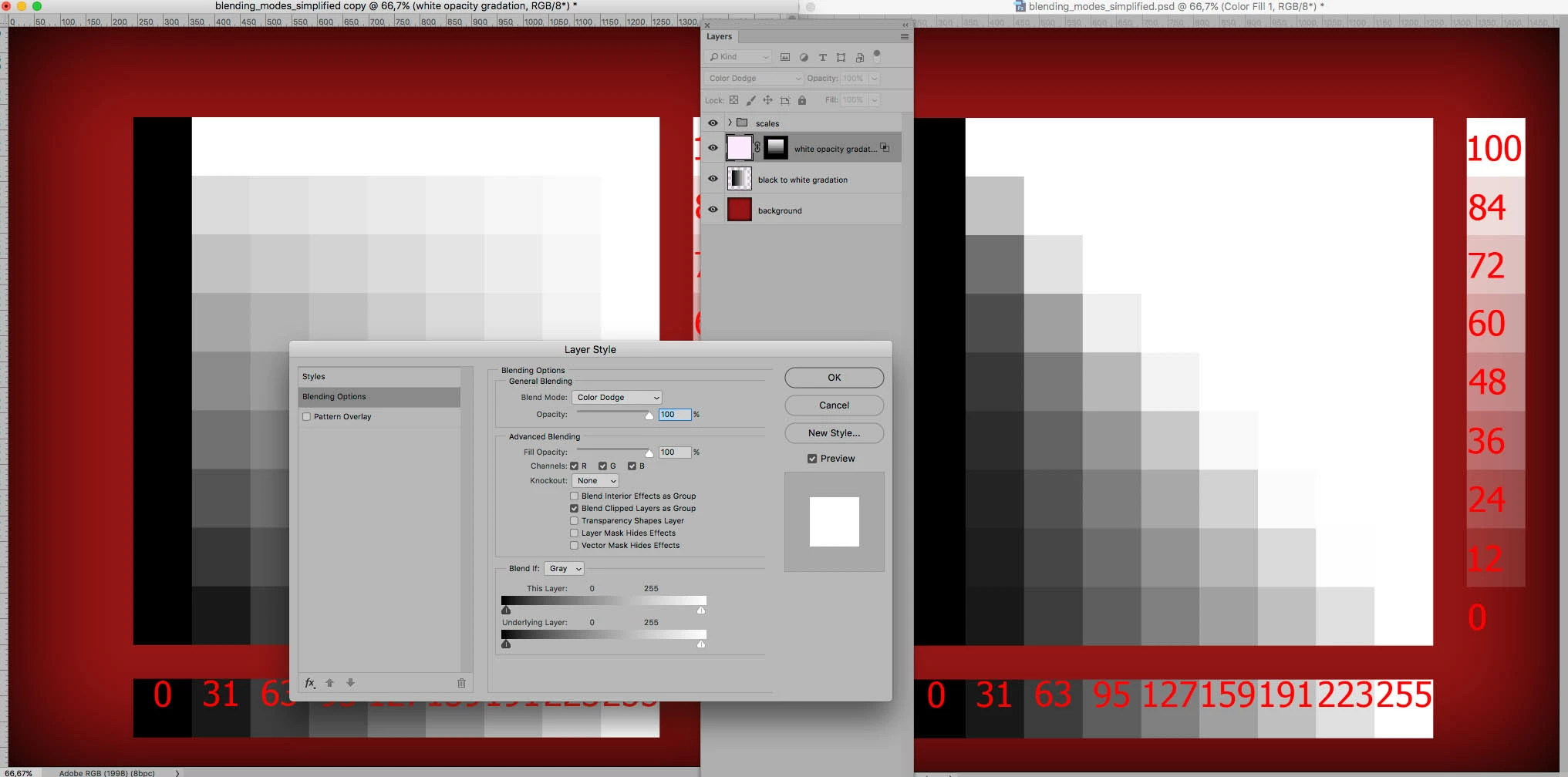 I'll add one more thing, saying that with the checkbox "transparency shape layers" color dodge does not work - it's not true. Since if you mix the brightness of 0 and the brightness from 1 to 255, we get 0, which completely corresponds to the formula color dodge. But the rest of the blending is like a simple blending of two layers with some opacity.