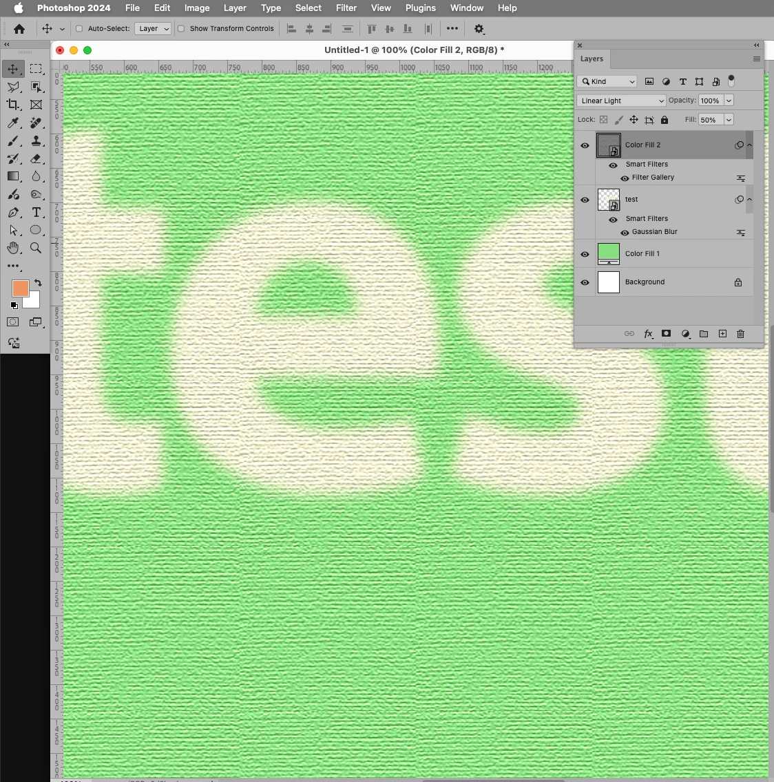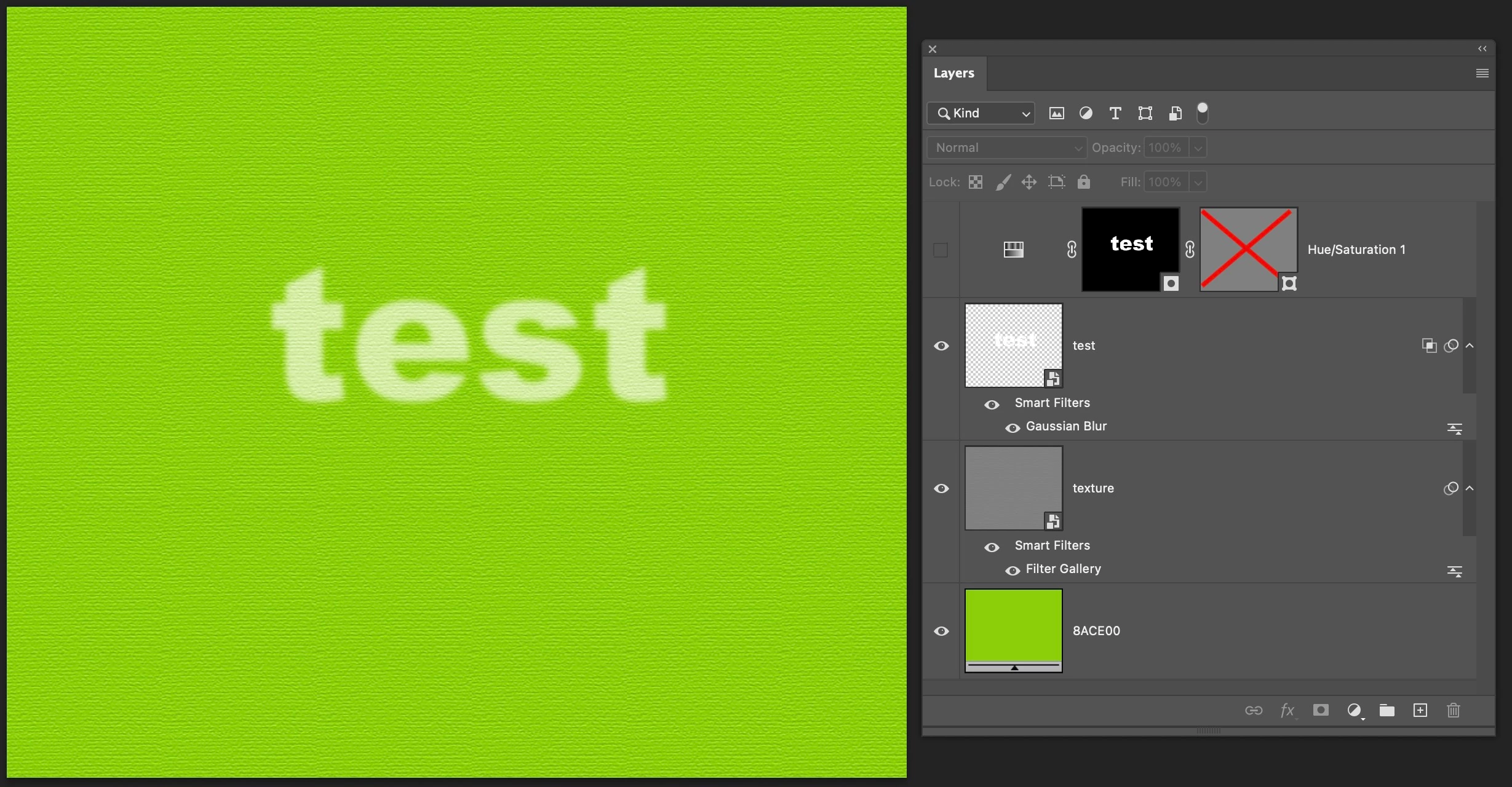 I have a layer stack that has solid color, texture set to linear light, and pure white text that I'm trying to apply. using blend if on the text layer brings the texture through, which is good, but then also shows the color of the layer beneath, which is bad. I need to destaurate the text somehow without using a mask, just in case I need to transform or change the text later on. The goal is for the text to blend with the texture, but desaturate the color from beneath