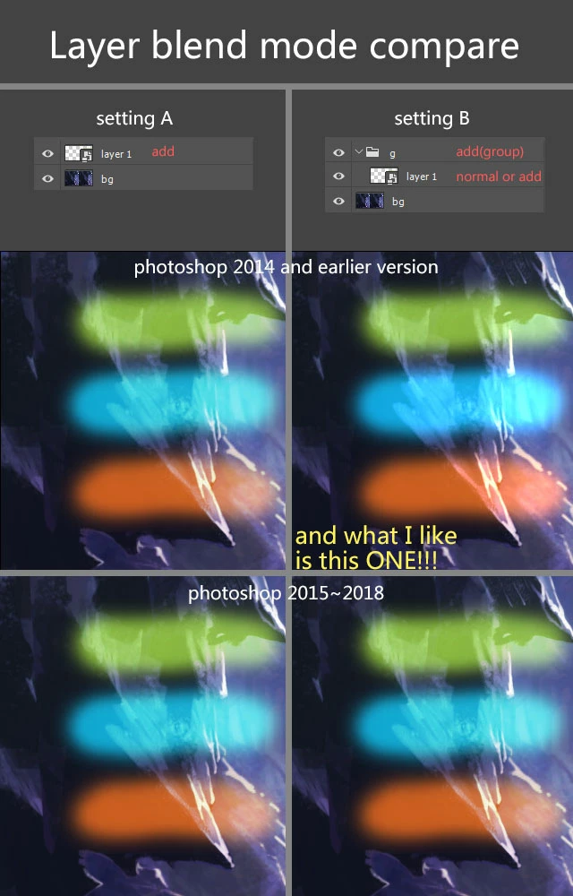 In earlier version, there is different result between layer blend mode and group blend mode. In most cases, I chose group blend mode .