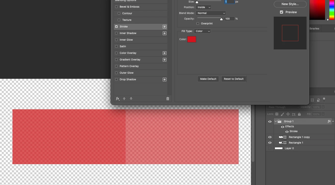 In this image, I have 2 rectangles (one with fill set to 90%, and the other one with fill set to 85%). They're both under a group which has the "stroke" effect with the size setting set to 1px and the position setting set to "inside". Both rectangles are black (#000) while the stroke color is fully red. In theory, an inside outline of 1 pixel around the 2 rectangles combined should show up, but for some reason it applies it to the entire thing.
