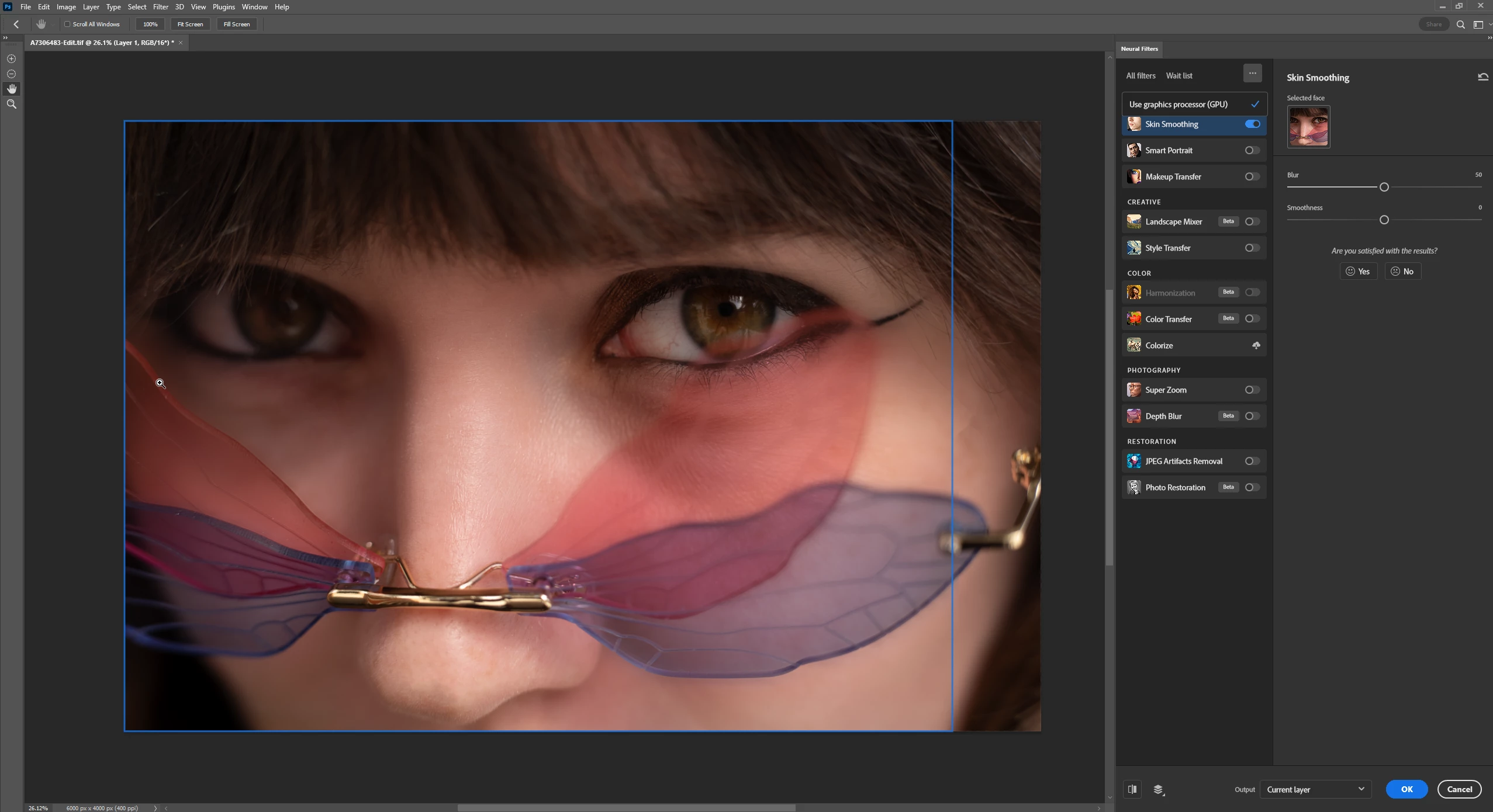 It's not selecting my model's whole face and it ends up creating a vertical dividing line in the final photo where the edited and unedited areas meet. Any help to get it to select the whole face? I looked for a button that would let me move the blue rectangle but I can't find one.
