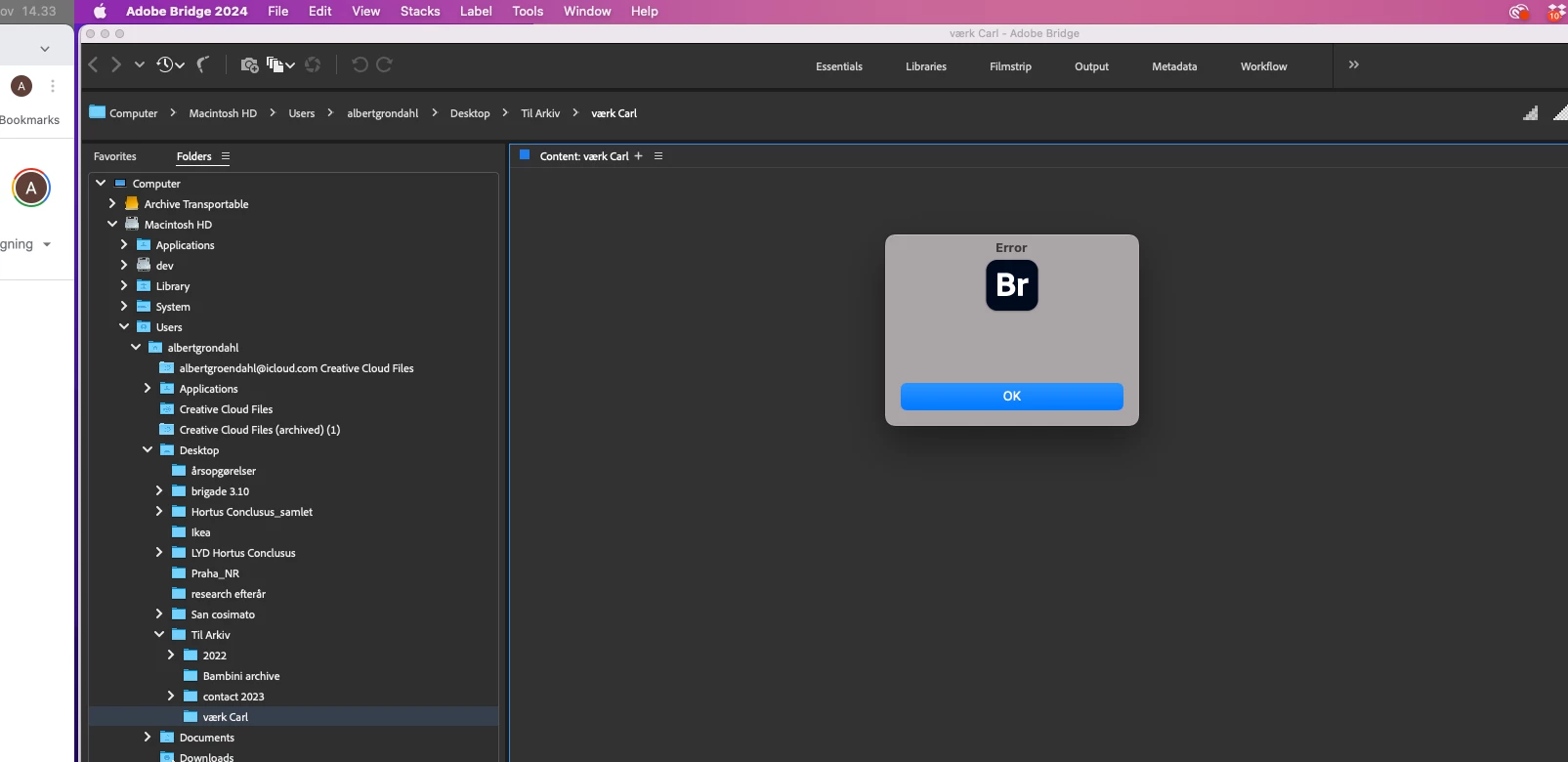 AAlbert337892454wb8ParticipantForum|Forum|2 years agoNovember 22, 2023QuestionBridge errorForum|Forum|2 years agoNovember 22, 20231 reply159 viewsHello, is anyone familiar to bridge issue, it says error when opening and crashes as you press ok in the box. Im working on MacOS Monterrey 12.7.1 all best hope for assistance macOS