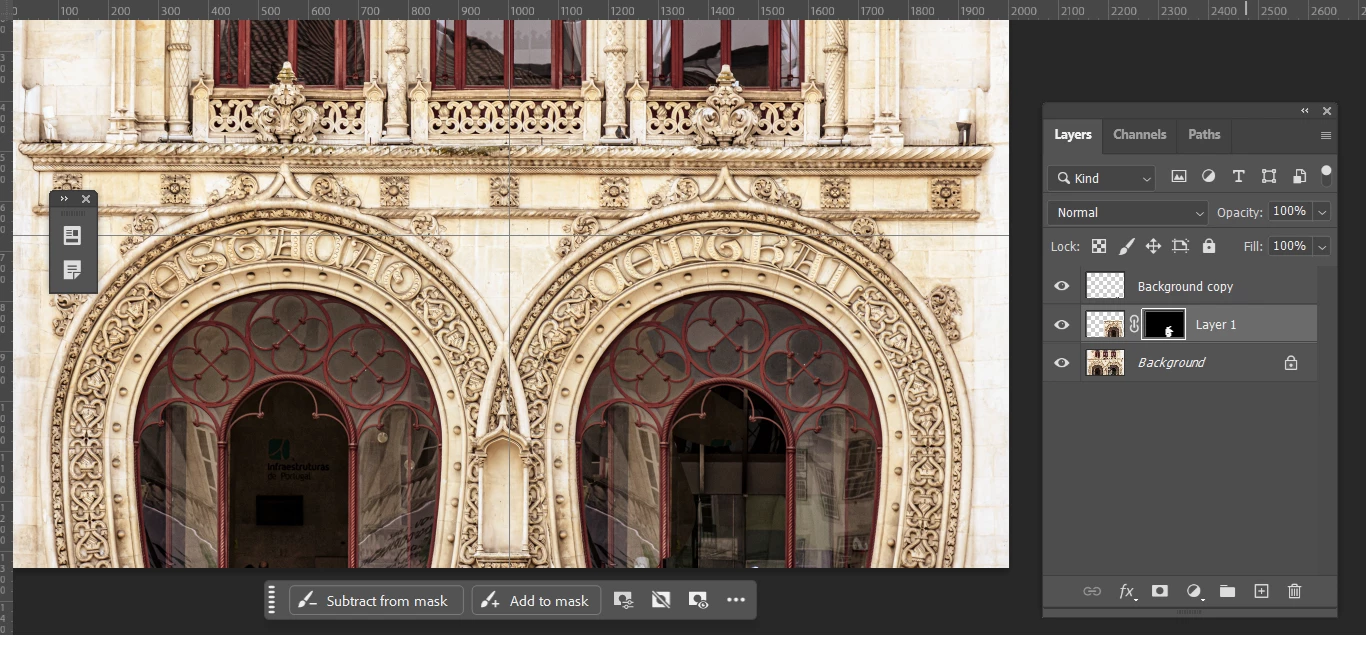 I am trying to remove a stop light from an image, but when I apply the brush it erases but leaves behind streaks of the arch as well as white strip. Any idea why the brush would leave a white strip or copy other parts of the arch? Previously, this image here was copied from the similar arch and laid on top with the move tool.