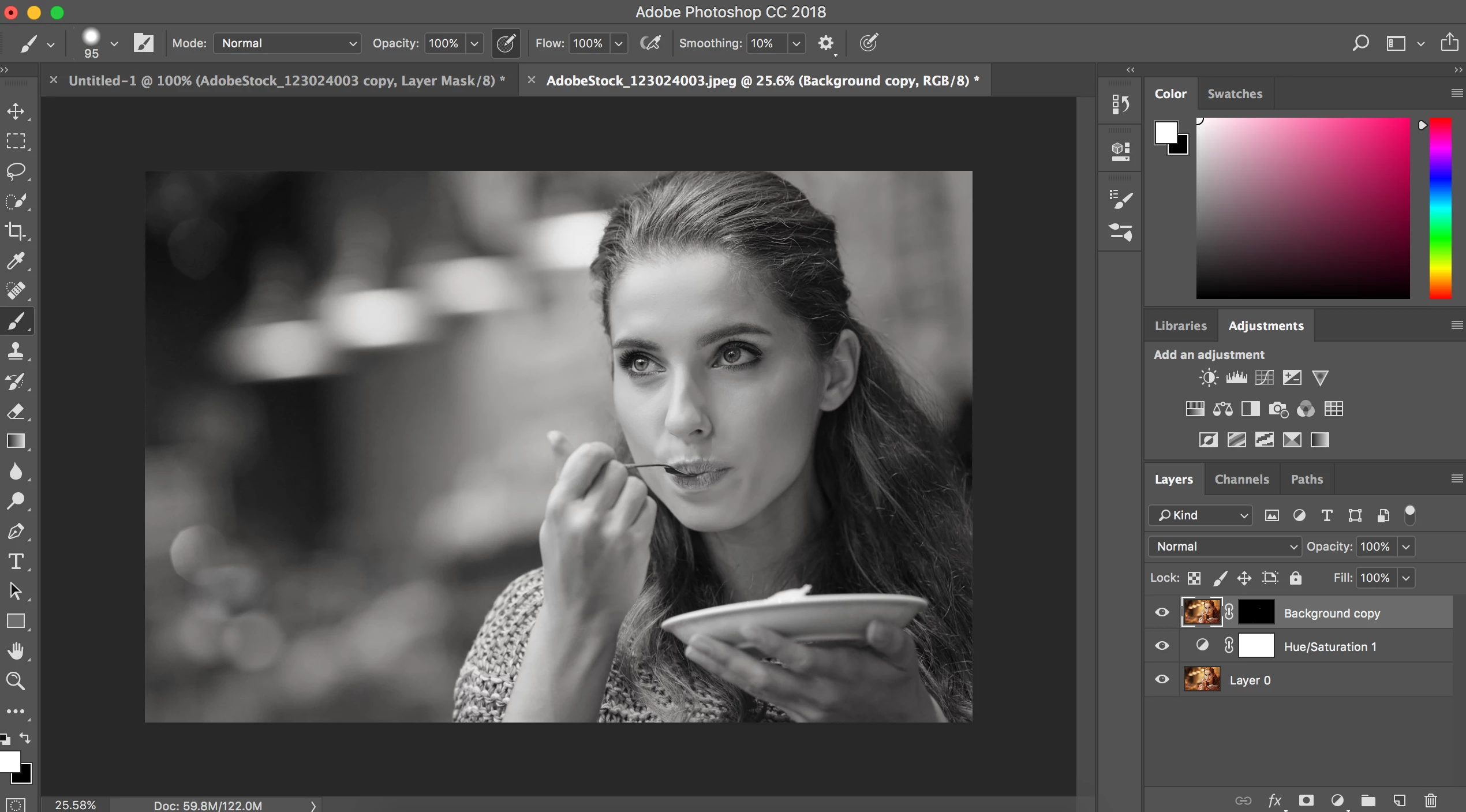 I want to brush out parts of Layer 1 image to bring out the colour.