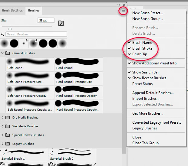 My brush panel currently displays brushe icons as long brush strokes, rather than the actual head. This makes it hard to see what it will look like without trial and error. Is there a way to toggle this? I've been through the options and can't seem to find it so thanks in advance for any advice.